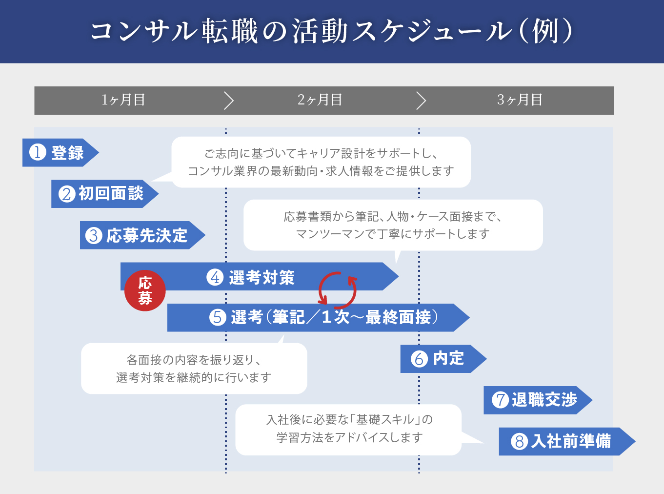 ここでは、コンコードのご支援を通じ、3ヶ月間の転職活動の末に総合ファームから内定を獲得されたご相談者を例に、転職活動の各ステップについて解説します。