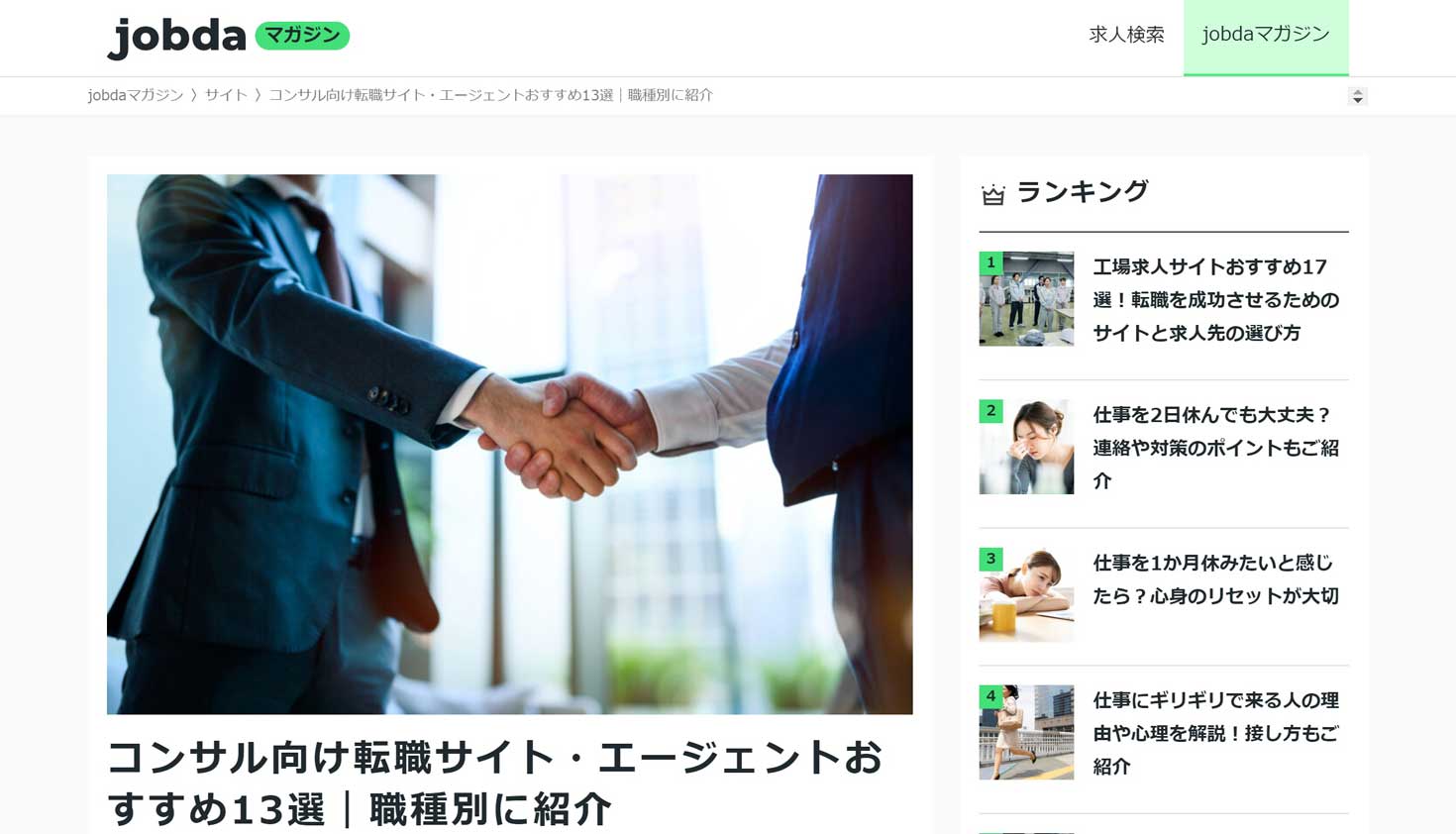 ジョブダ株式会社が運営する、転職や就職に役立つ情報を発信する情報サービス『jobdaマガジン』にて、コンサル業界、中でも戦略系コンサルティングファームに強い転職エージェントとして、弊社が紹介されました。