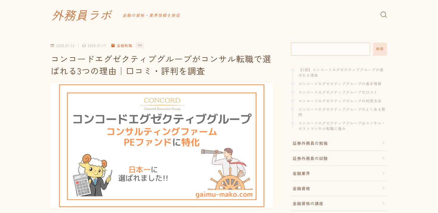 金融資格情報メディア「外務員ラボ」にて弊社が紹介されました 金融関連資格や金融業界の情報を発信するメディア『外務員ラボ』にてコンサル、PEファンドの転職に強いエージェントとして弊社が紹介されました。 詳細は、記事にてご確認頂けますと幸いです。 コンコードエグゼクティブグループがコンサル転職で選ばれる3つの理由|口コミ・評判を調査
