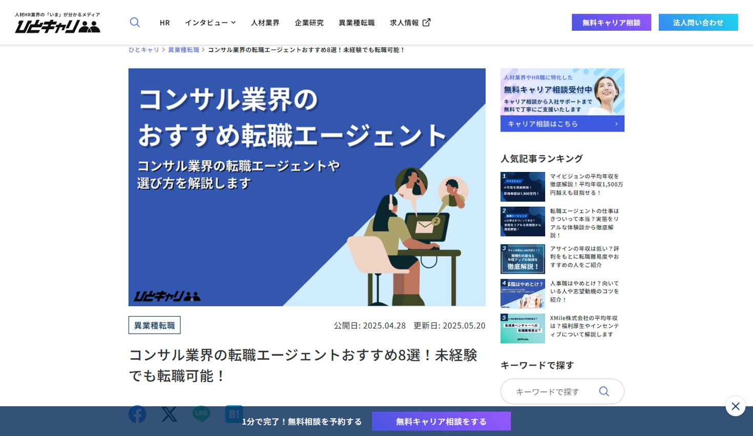 株式会社b&qの運営する【人材HR業界の「いま」が分かるメディア|ひとキャリ】 にて、「コンサル業界に強い転職エージェント」として、弊社が紹介されました。
